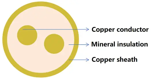Кабели с минеральной изоляцией состоят из медной жилы, минеральной изоляции из порошка оксида магния и медной оболочки. Когда кабели используются на заводах, где медь вызывает коррозию, можно добавить внешний слой поливинилхлорида (ПВХ). В зданиях или подземных помещениях, где для кабеля важны эстетика или легкий доступ, можно добавить безгалогенную внешнюю оболочку с низким уровнем дыма.