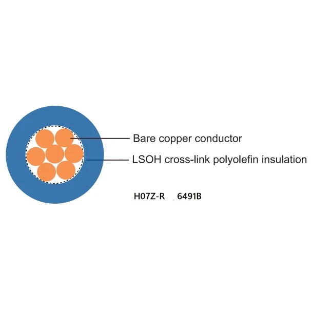 Изолированный одножильный кабель LSZH, состоящий из медного проводника T1R и изоляции из перекрестного полиолефина LSOH (также называемого термореактивным LSOH).
